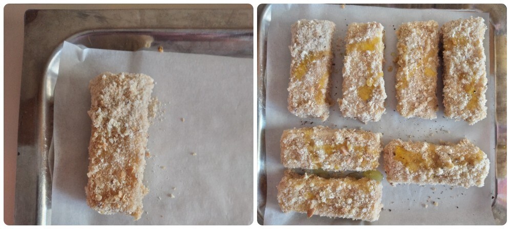Während Sie die Käsescheiben panieren, legen Sie sie auf ein mit Backpapier ausgelegtes Backblech und geben Sie über jede Scheibe einen Faden extra natives Olivenöl.