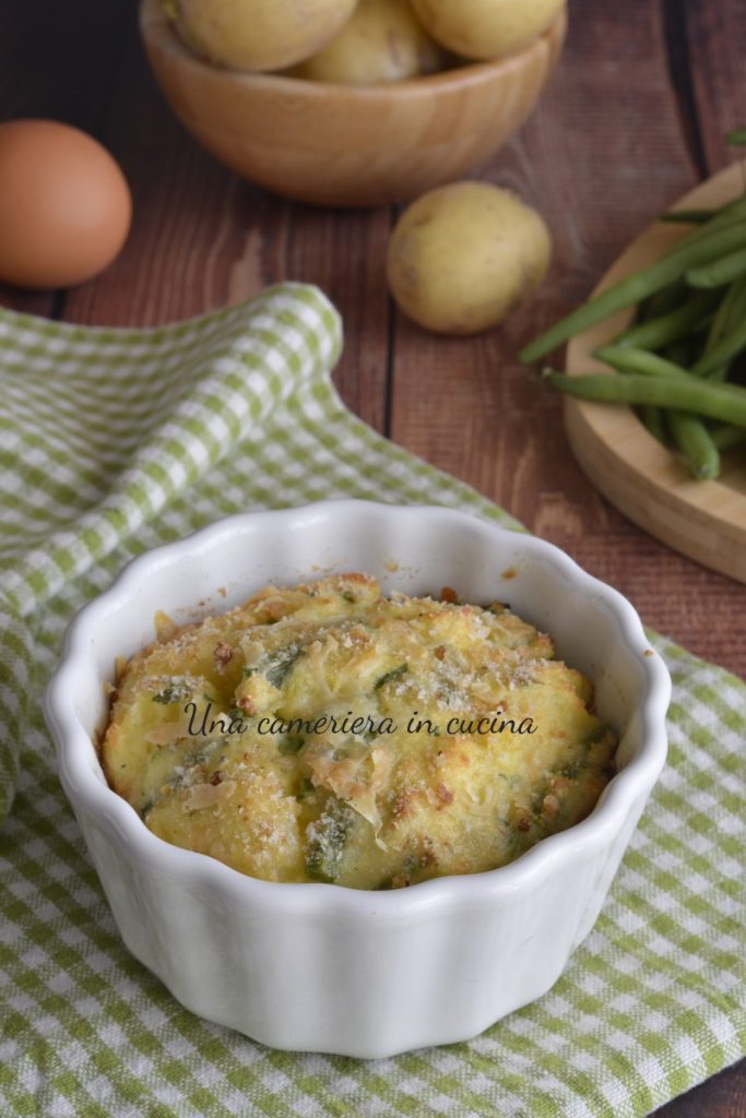 Die grüne Bohnen und Kartoffeltorte – leichtes Rezept ist ein einfaches und leichtes Gericht. Ein zartes Auflaufgericht mit gekochten Kartoffeln, gekochten grünen Bohnen, geriebenem Käse, Semmelbröseln und Eiern. Ideal als Vorspeise, auch in praktischen Einzelportionen, Beilage oder Hauptgericht zusammen mit Gemüse zu servieren.