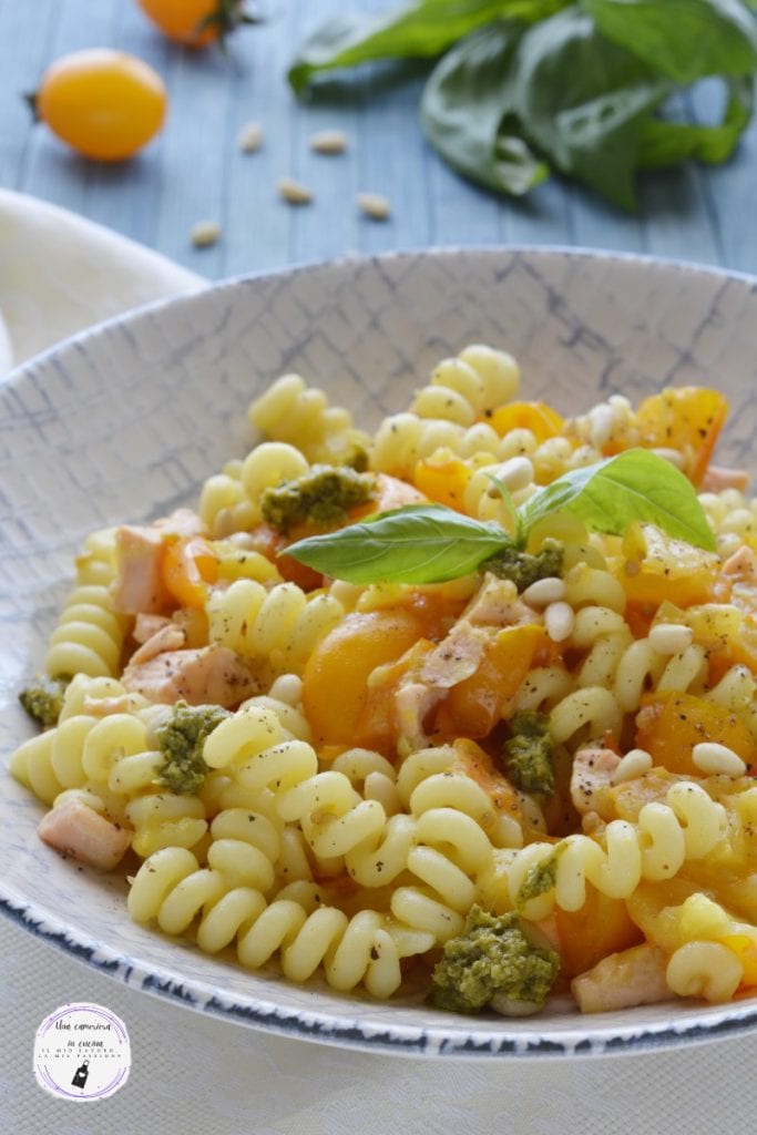 Heute schlage ich euch die Pasta mit Lachs, gelben Tomaten und Pesto vor, ein ideales Hauptgericht, um diesen noch warmen Herbst zu genießen, in dem der Sommer nicht zu Ende gehen möchte. Für dieses Rezept habe ich kurze, hohle Fusilli verwendet, aber ihr könnt auch gerillte Penne oder Farfalle verwenden. Die Sauce ist einfach, aber geschmackvoll, basierend auf frischem Lachs, gelben Tomaten und ein paar „Tropfen“ Genueser Pesto, das ihr entweder selbst zubereiten oder auch fertiges verwenden könnt.