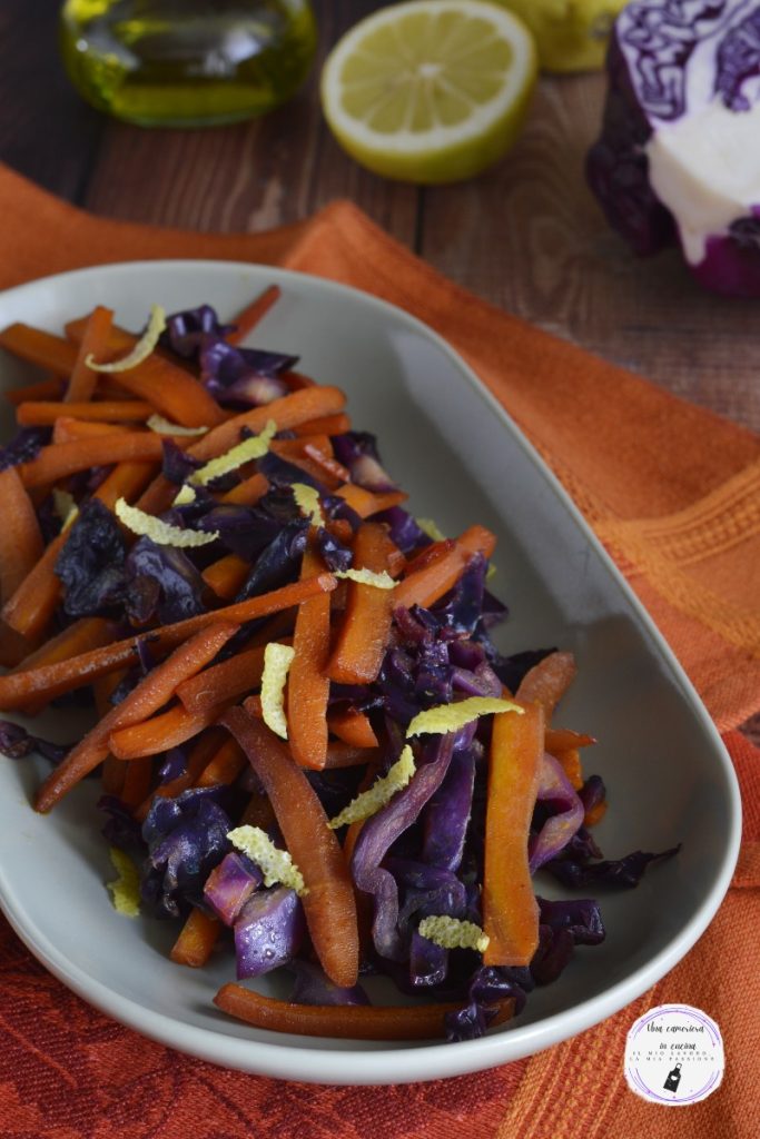 Der Rotkohl und Karotten mit Gewürzen ist eine einfache und köstliche Beilage. Perfekt zu Fleisch- oder Fischgerichten, schnell zubereitet und sehr lecker. Der fein geschnittene Rotkohl und die Karotten werden in Stifte geschnitten und in der Pfanne mit Olivenöl, Zitronensaft und Gewürzen gekocht. Ein tolles Pairing auch zu Basmatireis oder Nudeln.