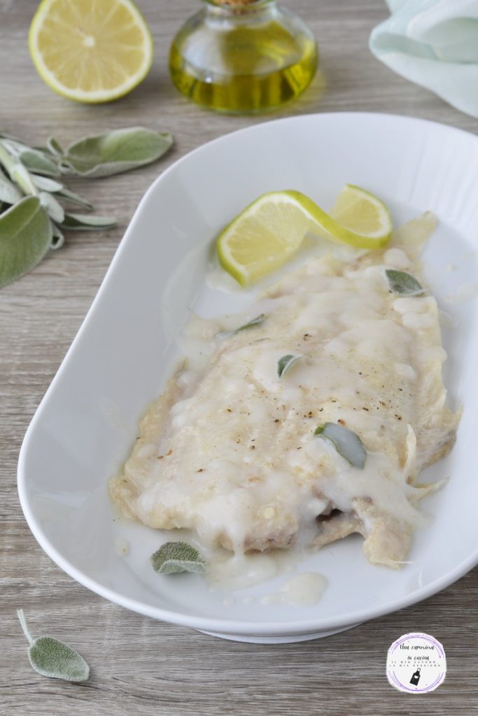 Salzen, pfeffern und servieren Sie den Seehecht heiß mit der Sauce aus Mehl, Zitrone und Salbei.