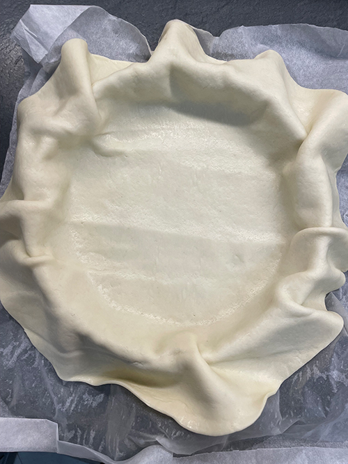 Ziehe die Teigränder zur Mitte hin und schneide das überschüssige Backpapier ab. Backe die herzhafte Torte bei 160 Grad für 14 Minuten.