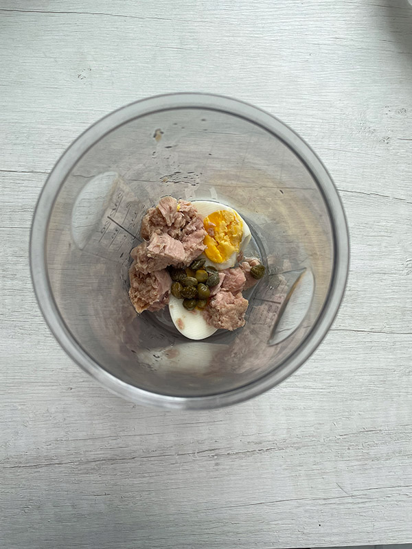 Legen Sie die Sardelle, das hartgekochte Ei, den Thunfisch und die Kapern in den Behälter des Stabmixers.