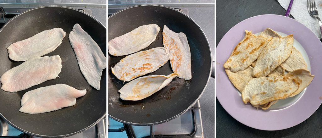 Erhitzen Sie eine Antihaft-Pfanne und braten Sie die Hähnchenscheiben bei mittlerer bis niedriger Hitze ohne Zugabe von Fett, indem Sie sie zur Hälfte der Garzeit wenden.