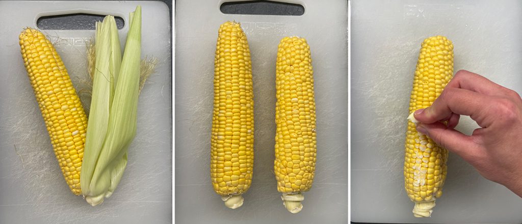 Entferne zuerst die Blätter und Fäden von den Maiskolben, dann wasche und trockne sie mit einem sauberen Tuch.