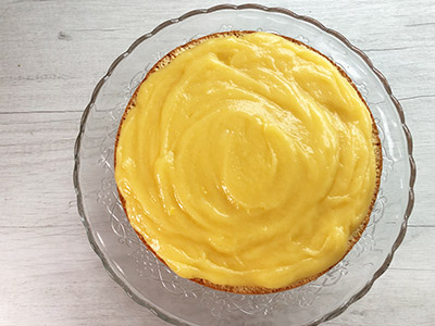 Wenn der Kuchen kalt ist, schneide ihn horizontal in zwei Teile, gieße die Creme auf den Boden, glätte sie mit einem Löffel und decke sie mit der oberen Hälfte ab.