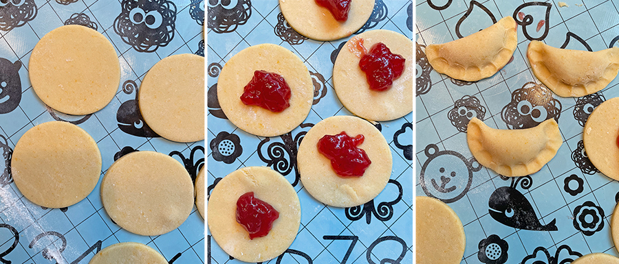 Rolle den Teig mit einem Nudelholz, mit etwas Mehl, aus, er sollte ziemlich dünn sein. An diesem Punkt schneide Kreise mit einem Ausstecher von 10 Zentimetern oder einem Glas aus, gib etwas Konfitüre in die Mitte, befeuchte die Ränder mit einem Tropfen Wasser und verschließe sie gut mit den Fingern.