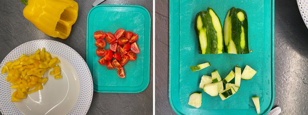 Während der Reis kocht, schneide die Cherrytomaten in Viertel, die Paprika und die Gurke in Stücke (ich habe etwas von der Schale entfernt).