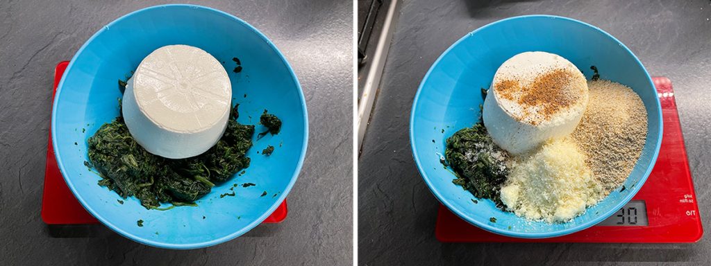 Gib den Spinat in eine Schüssel, schneide ihn mit einer Schere, damit die Stücke nicht zu lang sind, und füge Ricotta, Muskatnuss, Pfeffer, Semmelbrösel und geriebenen Käse hinzu.