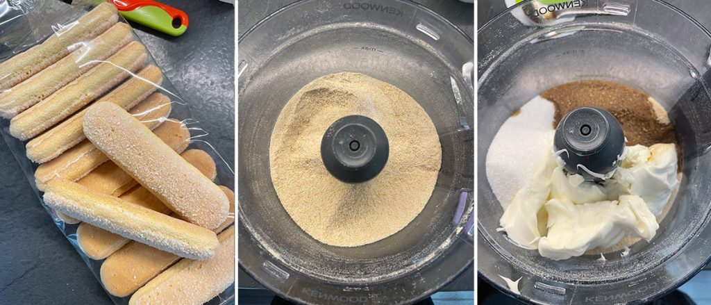 • Gib die Löffelbiskuits in eine Küchenmaschine und mixe sie. Sobald du ein Pulver erhalten hast, füge den Mascarpone, den Zucker und den Kaffee hinzu. Mixe weiter, bis du eine homogene Masse erhältst.