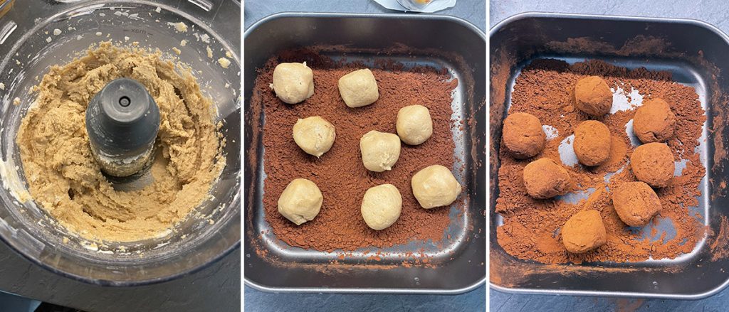 • Nimm etwas von der Masse und forme Kugeln, wälze sie im Kakao und lege sie auf einen Teller, wenn du möchtest, auch in Papierförmchen. Ich habe sie leicht mit den Fingern gedrückt, um ihnen eine unregelmäßige Form zu geben, wie Trüffel.