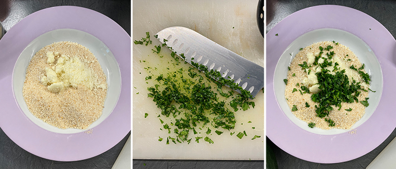 Zuerst bereite die Panade für das Überbacken vor: Gib die Semmelbrösel, eine Prise Salz, den Käse, den zerdrückten Knoblauch und die gehackte Petersilie auf einen Teller.