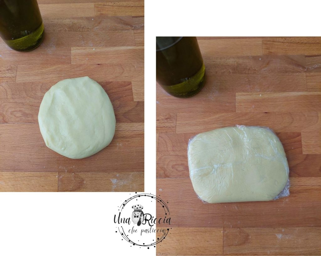 Wir kippen den erhaltenen Teig auf ein Nudelholz und bearbeiten ihn schnell, bis eine glatte und homogene Kugel entsteht, die wir flachdrücken und in Frischhaltefolie wickeln, bevor wir sie für mindestens eine Stunde im Kühlschrank ruhen lassen.