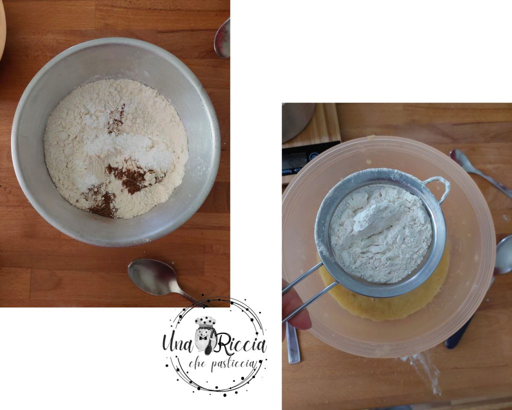 In einer Schüssel geben wir das Mehl, das Backpulver, das Bikarbonat, das Salz und den Zimt und mischen. Wir fügen die Pulver dem Ei- und Zuckergemisch hinzu, indem wir sie sieben, um keine Klumpen zu bilden. In drei Schritten hinzufügen und dazwischen umrühren.
