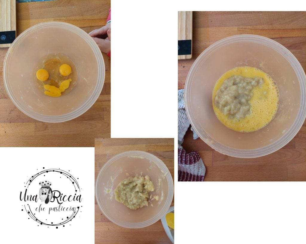Einfache Zutaten, die wir immer zu Hause haben, wie die klassischen Eier, Mehl, Zucker und Öl, kombiniert mit den zerdrückten reifen Bananen, um einen bereits so leckeren Teig zu schaffen, den ich heute mit vielen Trockenfrüchten und dunkler Schokolade bereichert habe.