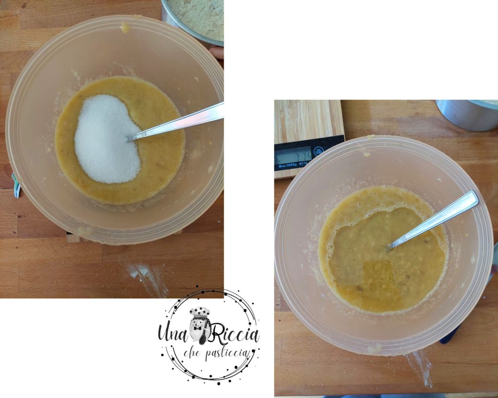 Zum erhaltenen Teig geben wir auch den Kristallzucker hinzu und nach dem Mischen auch das Pflanzenöl, dann erneut mit einem Spatel mischen. Wenn gewünscht, könnt ihr die gleiche Menge Butter verwenden, die im Wasserbad geschmolzen und etwas abgekühlt wurde