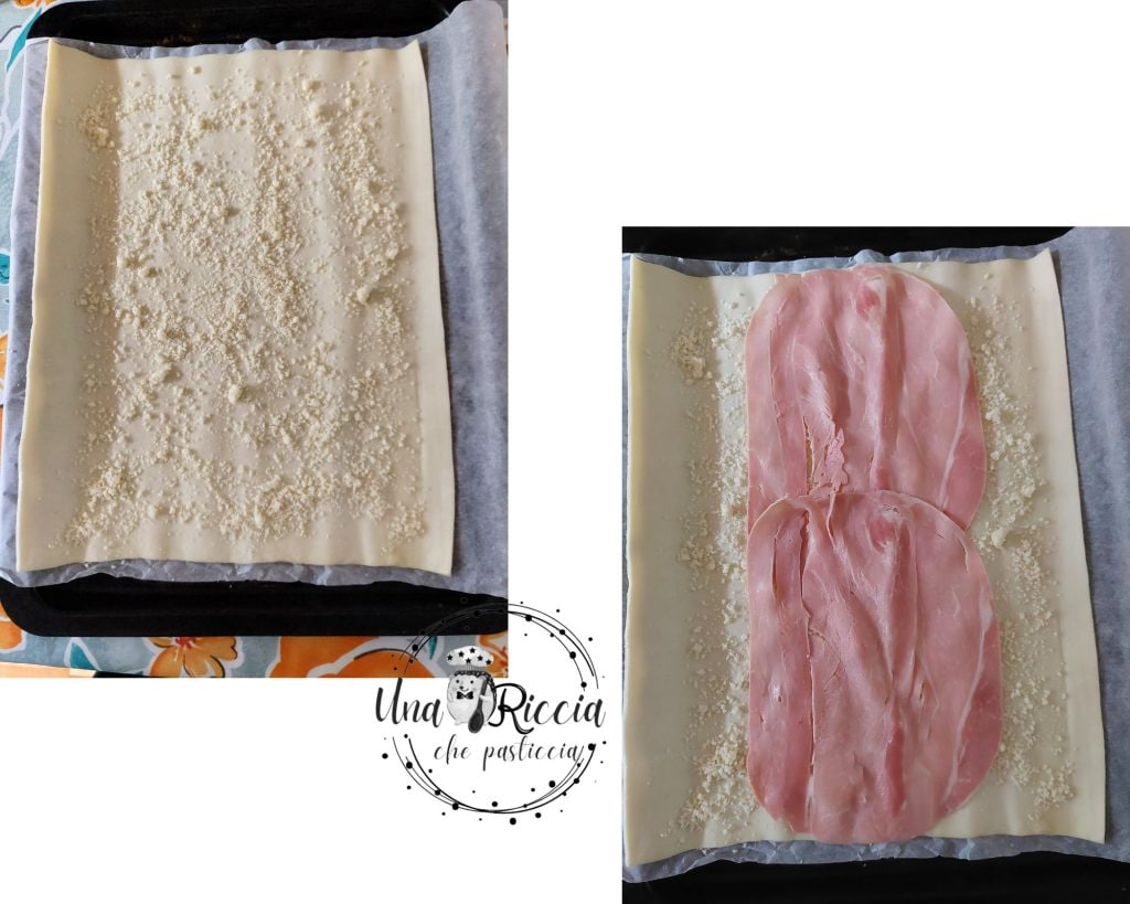 Nehmen wir den Blätterteig und rollen ihn direkt in der Form ab, zusammen mit dem Backpapier, dann bestreuen wir die Oberfläche mit dem geriebenen Parmesan und legen in der Mitte die Scheiben gekochten Schinken entlang der Längsseite.