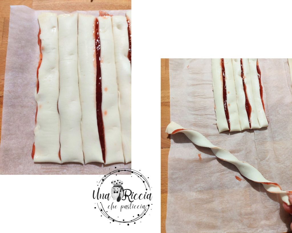 Mit einem scharfen Messer oder einem Pizzaschneider schneiden wir 12 Streifen von etwa gleicher Größe. Ich habe zuerst in der Mitte geteilt und dann die Streifen geschnitten. Sobald wir die Blätterteigstreifen haben, nehmen wir einen, ziehen ihn leicht und rollen ihn auf, indem wir mit einer Hand nach vorne und mit der anderen nach hinten drehen, um den ‚Twist‘-Effekt zu erzielen.