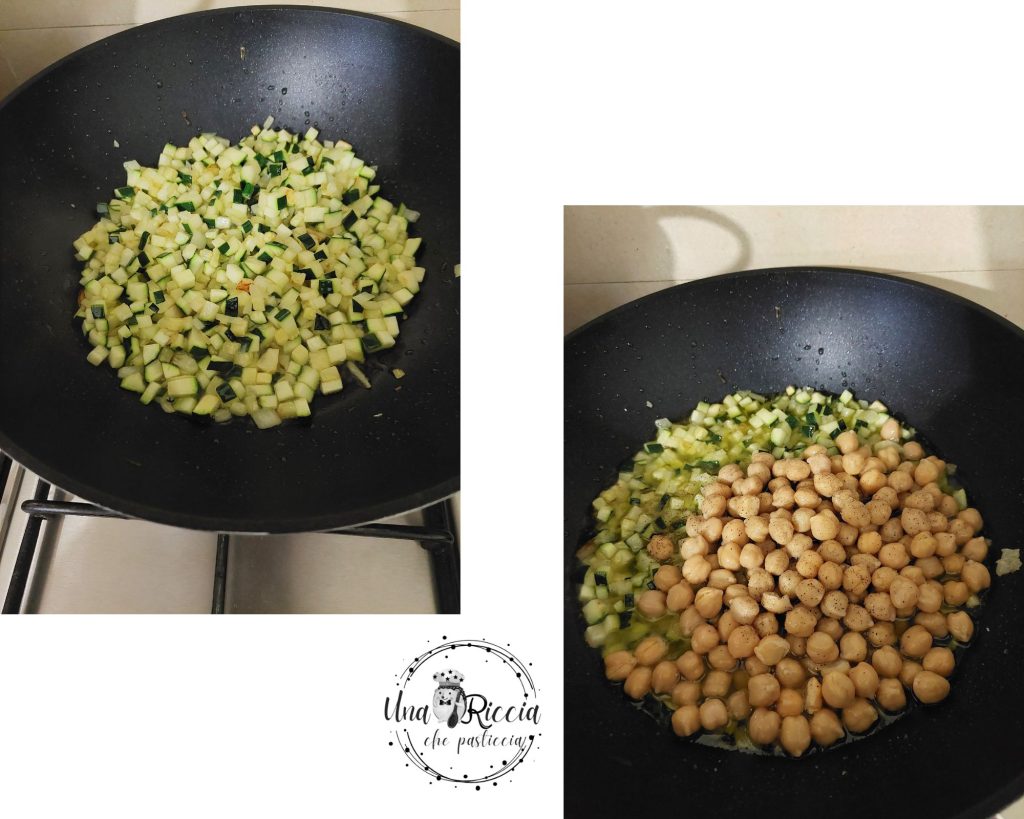 • Nach 4/5 Minuten fügen wir die abgetropften und gewaschenen Kichererbsen in die Pfanne, würzen mit Salz und Pfeffer und lassen sie ein paar Minuten mit den Zucchini kochen, indem wir etwas Wasser hinzufügen und umrühren. Wenn das Wasser verdampft ist, schalten wir die Flamme aus.