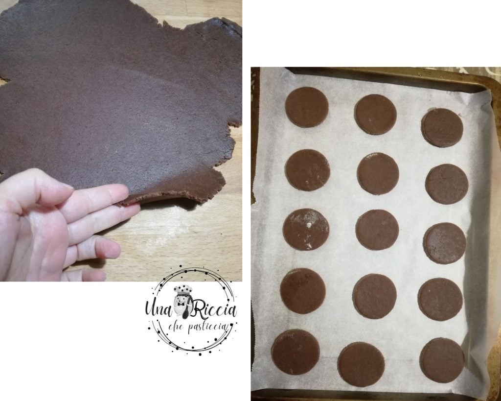 Alles detaillierter finden Sie hier.Nehmen wir unseren Kakaomürbeteig wieder auf, teilen ihn in zwei Hälften und rollen ihn auf eine Dicke von etwa einem halben Zentimeter aus. Mit einem runden Keksausstecher 30 Scheiben ausschneiden und auf einem mit Backpapier belegten Backblech anordnen.