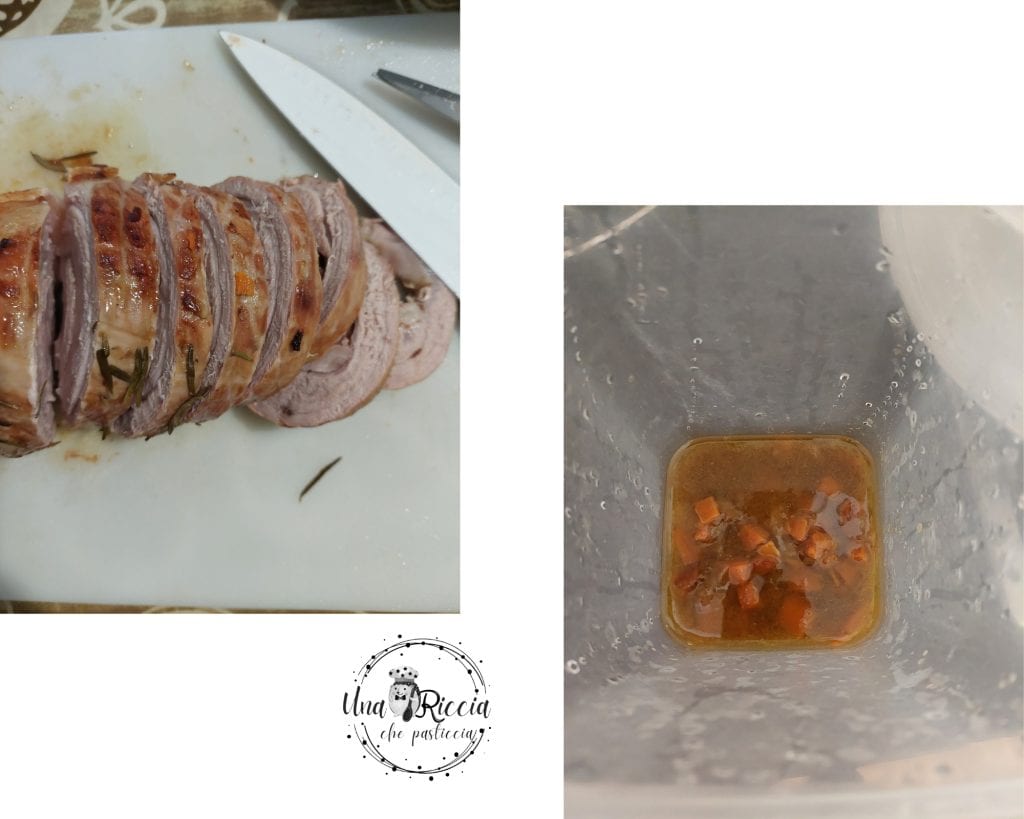 Nehmen wir das Fleisch, legen es auf ein Schneidebrett und lassen es abkühlen, bevor wir es in Scheiben schneiden. In der Zwischenzeit geben wir die Karotten mit der entstandenen Soße in einen Behälter und pürieren sie mit einem Stabmixer.