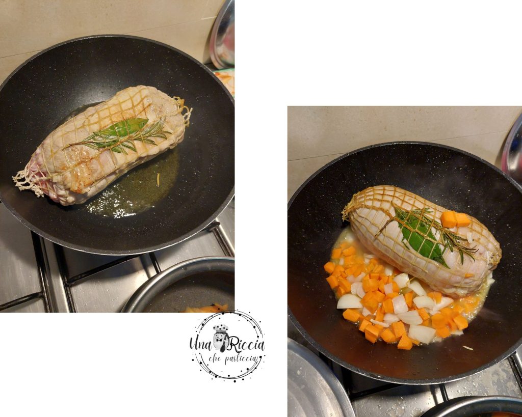 Lassen wir das Kalbfleisch von allen Seiten anbraten, damit es karamellisiert und eine Kruste bildet, die alle Säfte im Inneren des Fleisches hält und es zart macht. Wenn es von allen Seiten goldbraun ist, löschen wir mit Weißwein ab, lassen den Alkohol verdampfen, dann geben wir die Karotten und Zwiebeln hinzu, lassen sie eine Minute anbraten und fügen zwei Schöpflöffel Brühe hinzu.