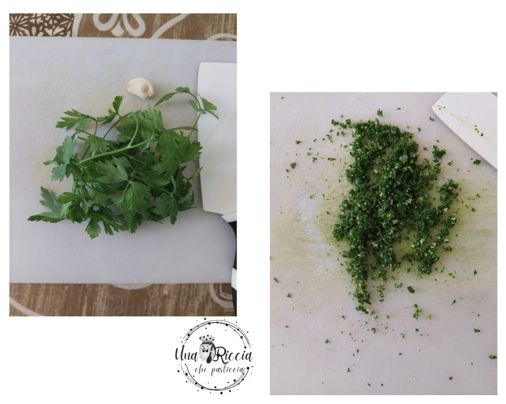 Da der Fisch bereits gereinigt ist, können wir mit der Zubereitung der Marinara-Sauce beginnen. Waschen und trocknen Sie die Petersilie gründlich, legen Sie sie auf ein Schneidebrett und hacken Sie sie zusammen mit einer geschälten Knoblauchzehe fein.