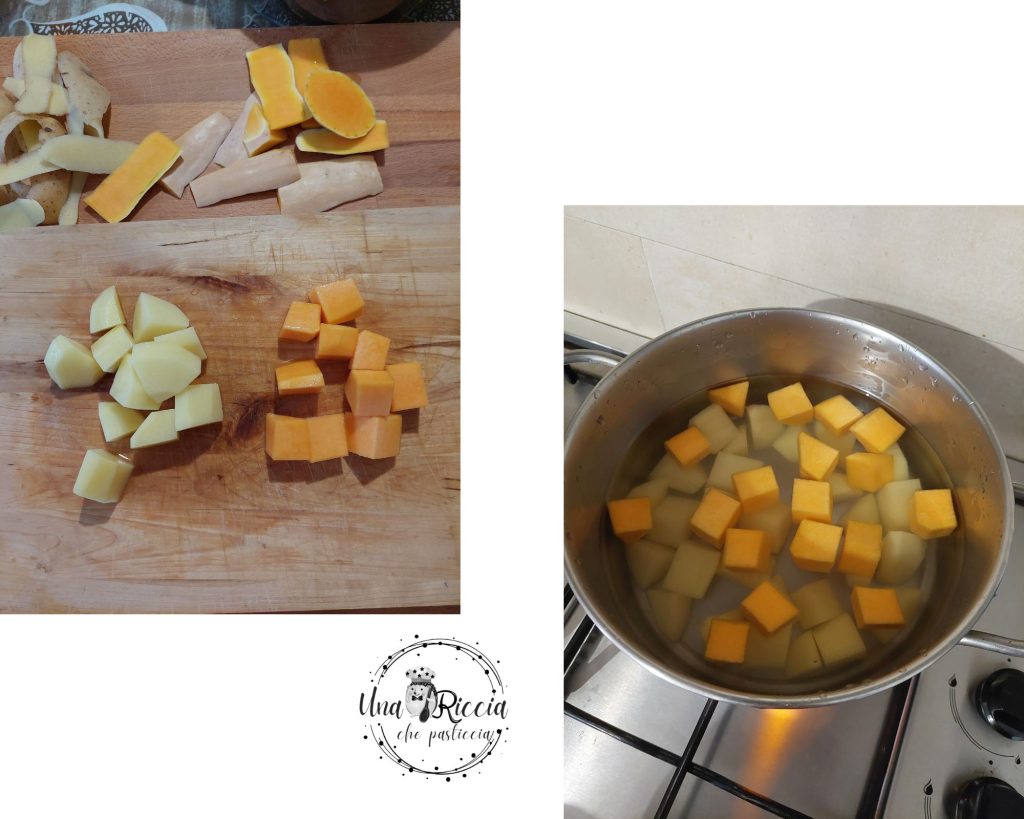 Wenn der Kürbis und die Kartoffeln gekocht sind, schöpfen wir sie mit einem Schaumlöffel in eine Schüssel und zerdrücken sie dann mit einer Gabel oder einem Kartoffelstampfer. An diesem Punkt fügen wir die anderen Zutaten hinzu, also die Semmelbrösel, den geriebenen Parmesan, eine Prise Salz und etwas frisch gemahlenen Pfeffer.