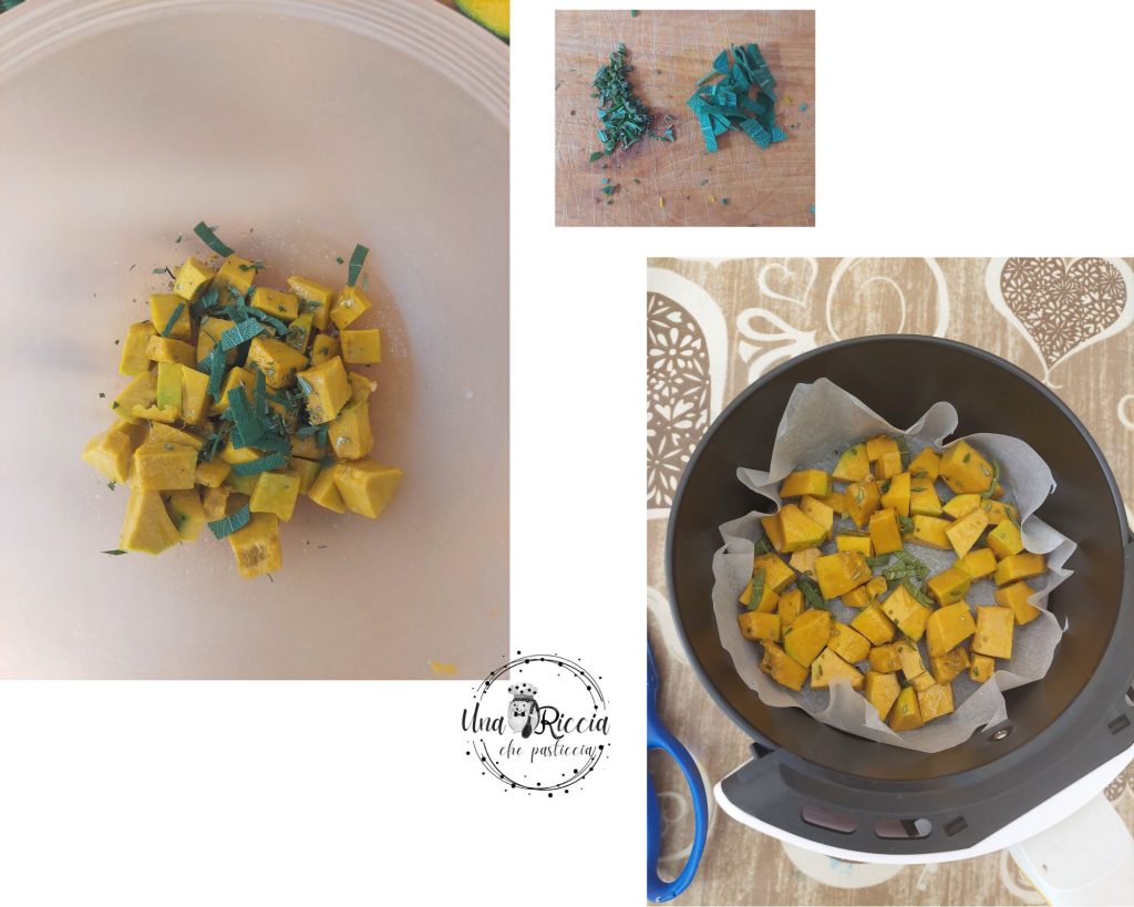 Wir waschen den Salbei und die Rosmarinnadeln, legen sie auf ein Schneidebrett und hacken sie klein. Dann geben wir die Kürbiswürfel in eine Schüssel und würzen sie mit Olivenöl, Salz und den gehackten Kräutern. Wir mischen mit einem Löffel, um den Geschmack zu entfalten. Wir legen etwas Backpapier in die Heißluftfritteuse und geben die gewürzten Kürbiswürfel hinzu.