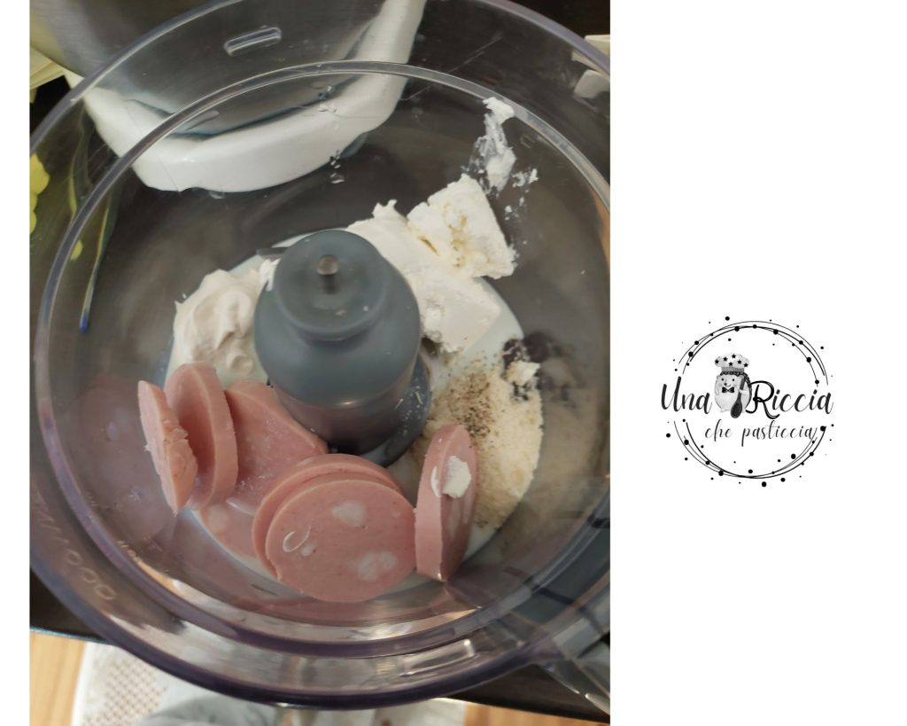 In die Mixerschüssel legen wir die in Stücke geschnittene Mortadella, den geriebenen Parmesan, die Ricotta und die flüssige Sahne, dann einschalten und pürieren, bis wir eine homogene Creme erhalten. Ich habe weder Salz noch Pfeffer hinzugefügt, da meine Mortadella schön würzig war, aber wenn Sie möchten, können Sie etwas hinzufügen.