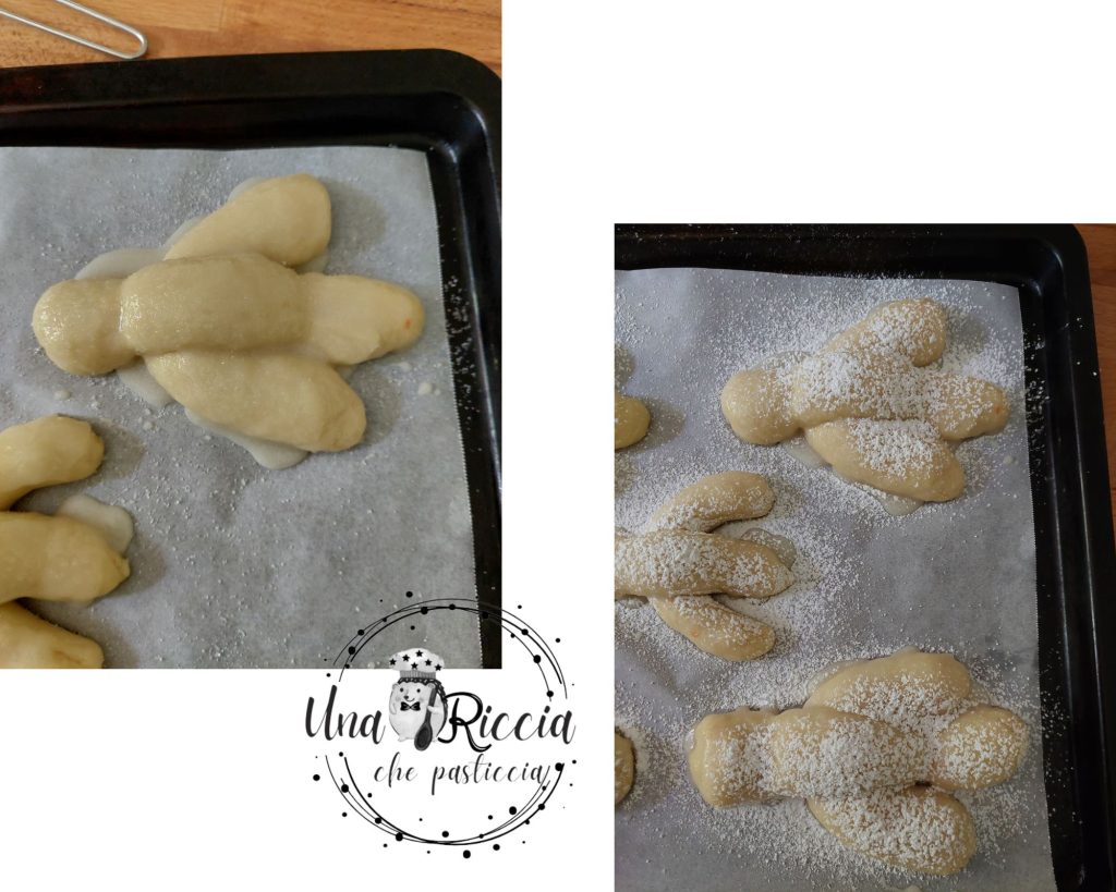 Nehmen wir den Teig und teilen ihn in Stücke von 50 Gramm und formen wir Kugeln, danach formen wir mit jeder Kugel eine leicht längliche Wurst (ca. 10 cm) und legen sie auf das Backblech in Form eines ‚C‘, nehmen wir eine andere Kugel und formen wir eine weitere Wurst, legen wir sie auf die vorherige, indem wir an einem Drittel vom Anfang und an einem Drittel vom Ende eine Einschnürung machen. Fahren wir fort, bis wir 9 Küchlein haben, die wir mit Abstand auf zwei mit Backpapier ausgelegte Backbleche legen.