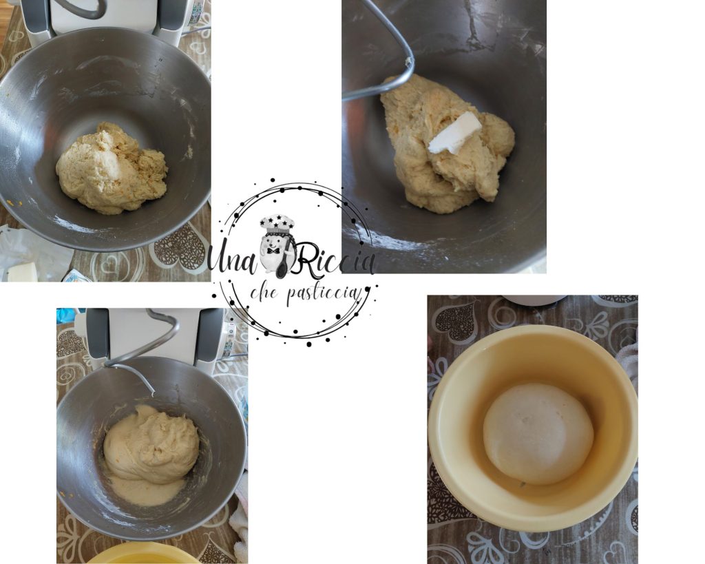 Wenn der Teig sich gut verbunden hat, beginnen wir die weiche Butter bei Raumtemperatur hinzuzufügen. Wir fügen ein Stückchen nach dem anderen hinzu und achten darauf, ein weiteres hinzuzufügen, erst wenn das vorherige vollständig aufgenommen wurde. Vor dem Einfügen der letzten Butterstücke fügen wir auch das Salz hinzu. Wir kneten für etwa 15 Minuten, bis der Teig schön glatt, homogen, elastisch und gut verknetet ist. Übertragen wir den Teig in eine Schüssel und decken ihn mit Frischhaltefolie ab. Lassen wir ihn im ausgeschalteten Ofen bis zur Verdopplung gehen, das dauert 2-3 Stunden.