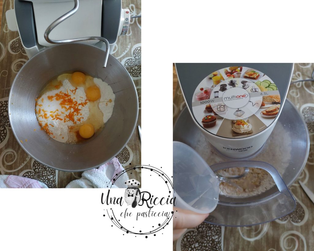 In der Schüssel der Küchenmaschine geben wir das Mehl, die Trockenhefe, die Eier, das Eigelb, den Honig, die Schale einer Orange, die Ampulle Orangenblütenaroma und den Zucker. Wir mischen und kneten alles mit dem Haken, nach und nach beginnen wir das Wasser in einem dünnen Strahl hinzuzugeben.