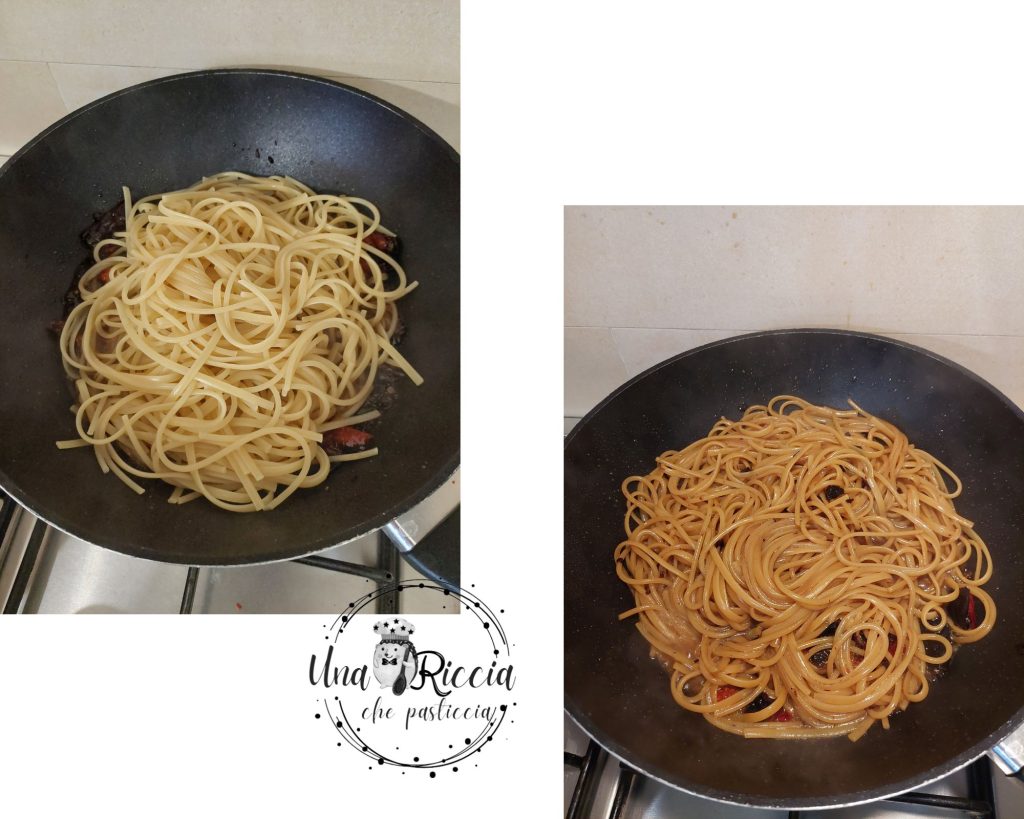Wenn noch 4 oder 5 Minuten Kochzeit für die Pasta übrig sind, lassen wir sie in die Pfanne abtropfen, schalten den Herd wieder ein und fügen ein paar Kellen Kochwasser hinzu, mischen gut und fügen bei Bedarf Flüssigkeit hinzu, bis die Kochzeit abgeschlossen ist.