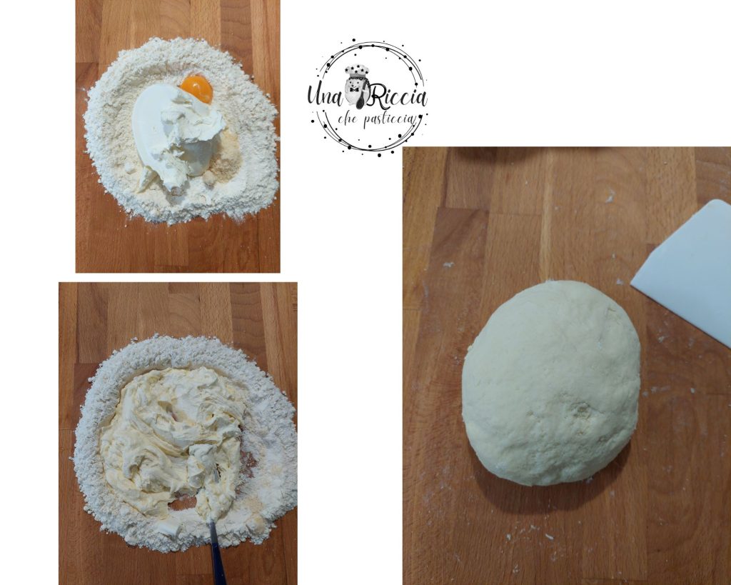 Auf einer Arbeitsfläche das Mehl ausstreuen und eine Mulde in der Mitte formen. Dann den Frischkäse, die Eigelbe, den geriebenen Parmesan und eine Prise Salz in die Mitte geben. Mit einer Gabel anfangen zu kneten, zuerst den Käse und die Eier vermischen und dann nach und nach das Mehl einarbeiten. Bei Bedarf mit einem Teigschaber helfen. Kneten, bis ein glatter und homogener Teig entstanden ist, der weich, aber gut formbar ist.