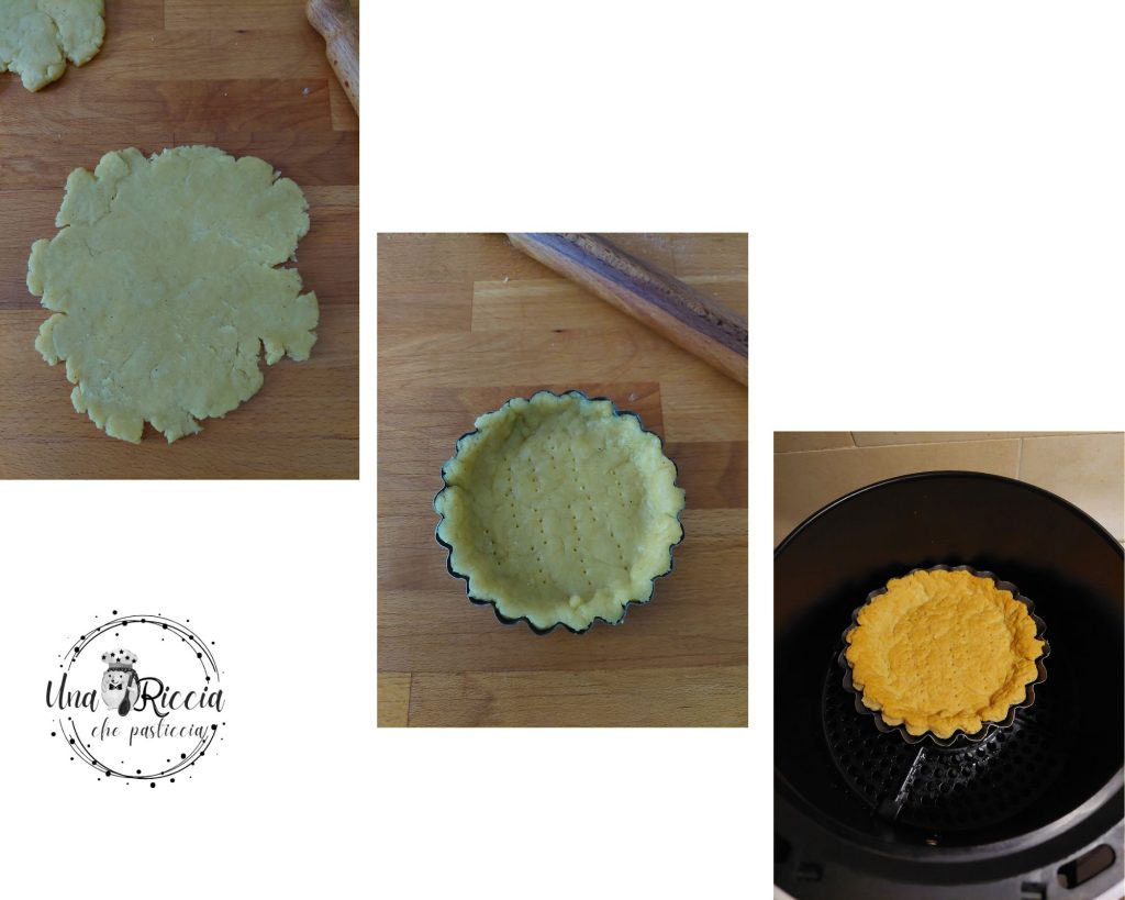 Den Mürbeteig auf eine Dicke von etwa 3 oder 4 Millimeter ausrollen und die Törtchenformen damit auskleiden, leicht mit einer Gabel einstechen und im vorgeheizten Ofen bei 180 Grad für 20/25 Minuten backen. Sie können sie auch in der Heißluftfritteuse bei 180 Grad für etwa 15 Minuten backen, bis sie goldbraun sind.