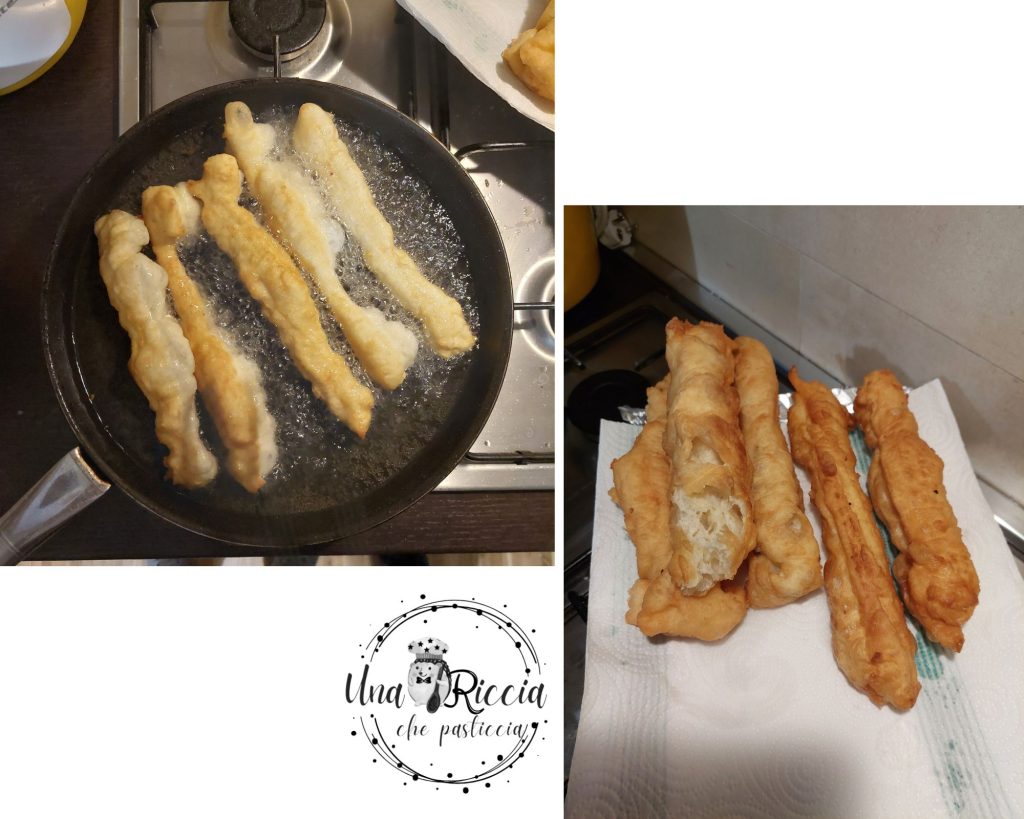 Wenn sie auf einer Seite goldbraun sind, drehen wir sie um, damit sie von allen Seiten gut goldbraun werden. Wir lassen sie bei mittlerer bis niedriger Hitze von allen Seiten garen. Wir machen weiter, bis der Teig aufgebraucht ist, und jedes Mal, wenn wir ein Stück Teig nehmen, ölen wir unsere Hände. Wir lassen die Crispelle auf Küchenpapier abtropfen, um das überschüssige Öl zu entfernen.