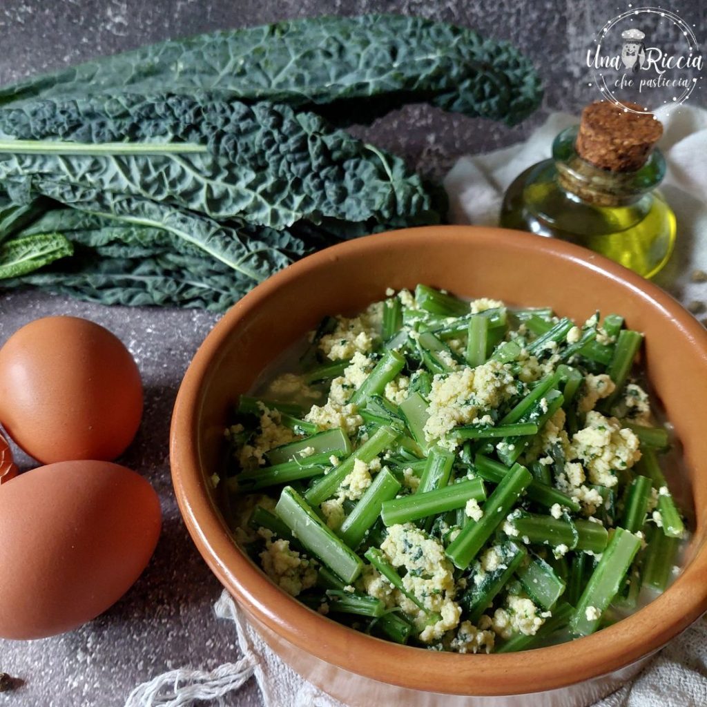 In dieser Zeit bereite ich oft köstliche Schwarzkohl- oder Reis-Schwarzkohlsuppen zu, aber diese Zubereitungen erfordern nur den Blattteil des Kohls und nicht die Rippen oder Stiele. Während ich sie putzte, kam mir in den Sinn, dass in den Abruzzen traditionell während der Weihnachtszeit Cardone mit Ei gegessen wird, und ich dachte, ich könnte dasselbe Rezept zubereiten, indem ich die Stiele des Schwarzkohls verwende. Das ist eine hervorragende Idee, um einen Teil dieses Gemüses, der sonst im Abfall landen würde, zu recyceln. Mit den Blättern können Sie neben Suppen auch ein herbstliches Pesto oder wunderbare Gnocchetti zubereiten.