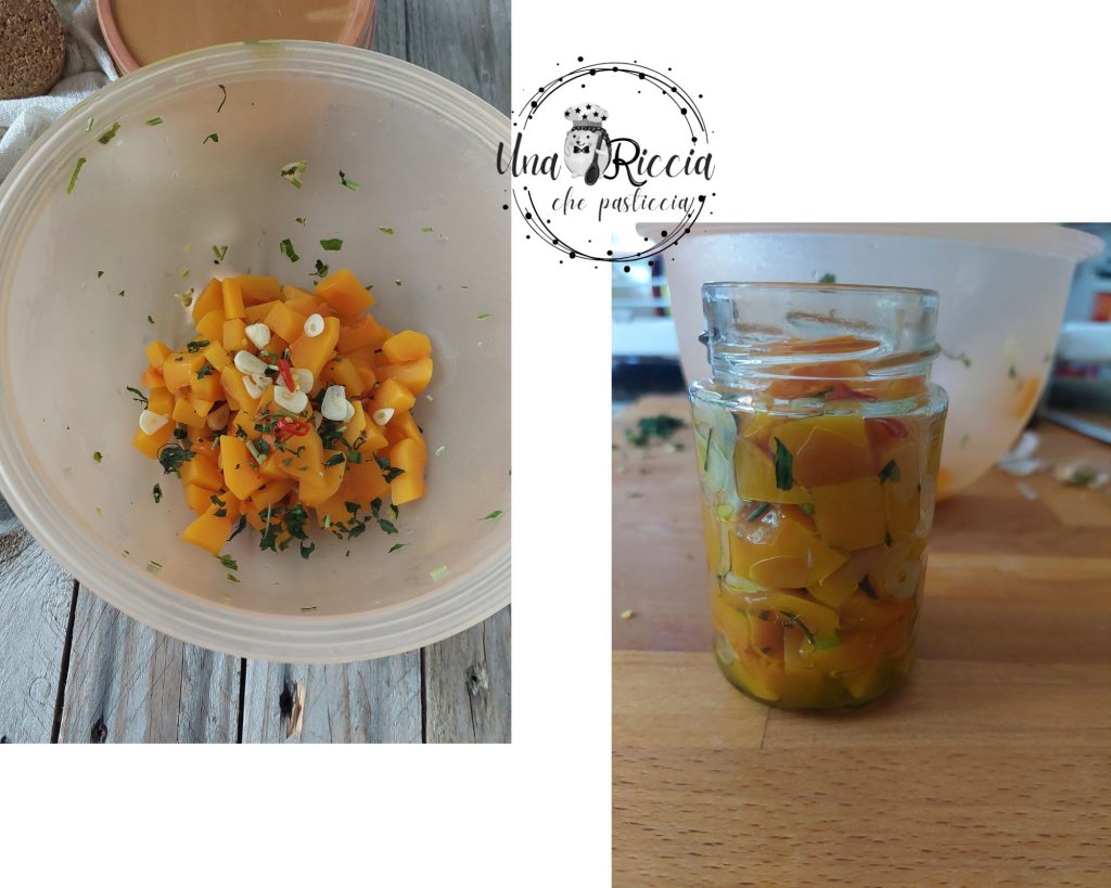 Die süß-saure Kürbiskonserve wird mit Knoblauchscheiben, Petersilie und Chili gewürzt, und in einer Mischung aus Weißweinessig, Zucker und Salz gedünstet, die den süß-sauren Teil bildet.