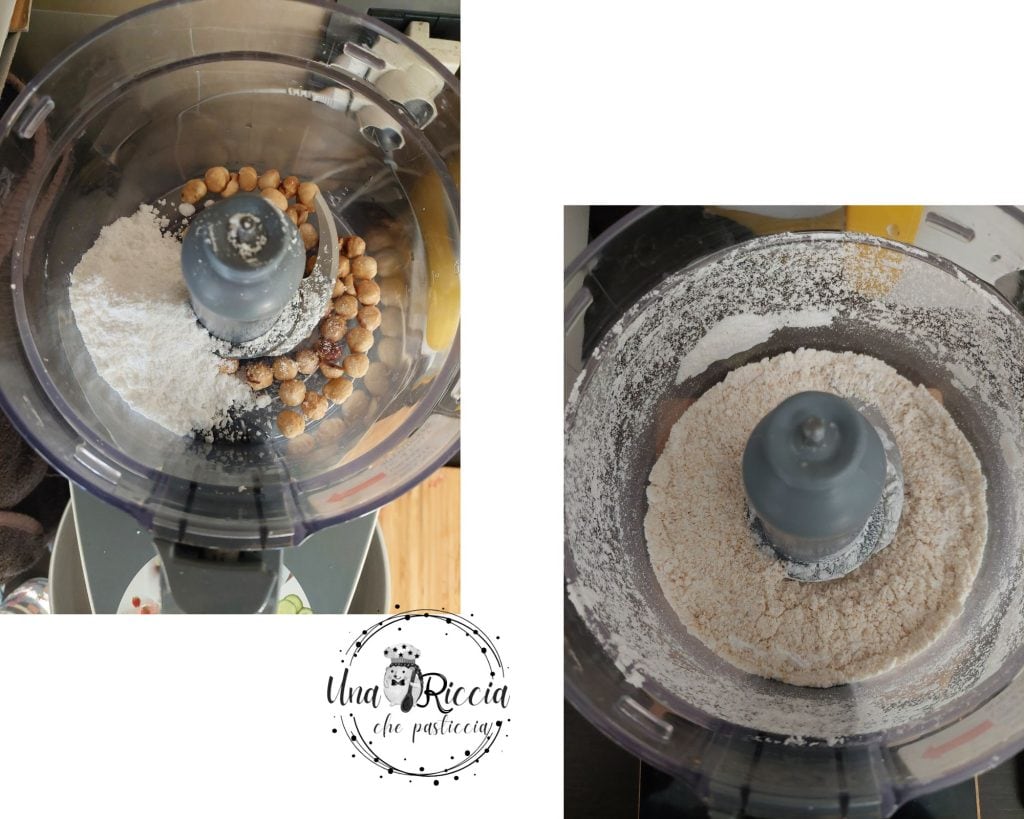 In den Mixer geben wir das Mehl und die kalte Butter in Stücken und mixen, um eine krümelige Konsistenz zu erzielen, dann geben wir das Ei, eine Prise Salz und das Haselnussmehl hinzu, schalten den Mixer erneut ein und mixen, bis der Teig sich bindet.