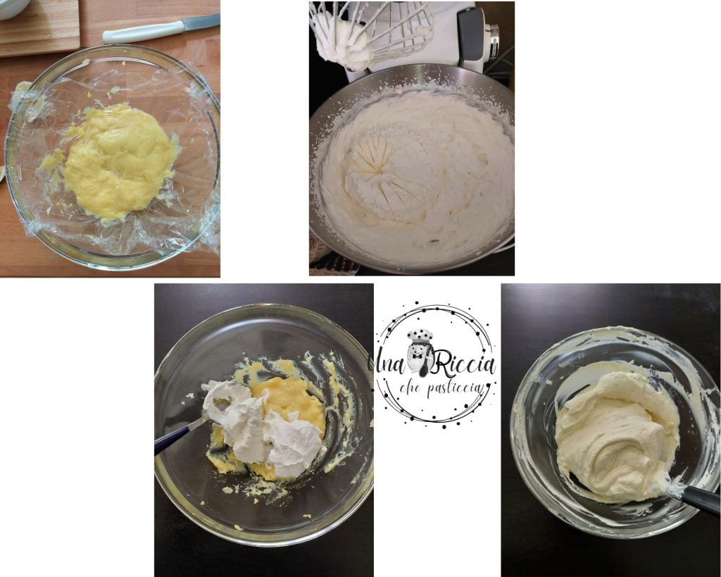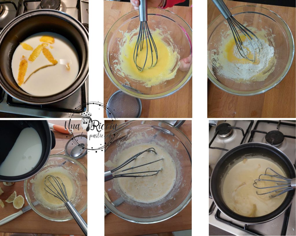 In einen kleinen Topf geben wir die Milch und die Zitronenschale, achten darauf, nur den gelben Teil mit einem Sparschäler abzunehmen, auf den Herd stellen und erwärmen. In einer Schüssel die Eigelbe und den Zucker mischen, um eine helle, schaumige Masse zu erhalten, dann das gesiebte Mehl und die Kartoffelstärke hinzufügen und erneut mischen, dann die lauwarme Milch einfüllen und erneut mischen. Die Masse zurück in den Topf geben und bei niedriger Hitze kochen, bis sie eindickt, etwa 10 Minuten lang.