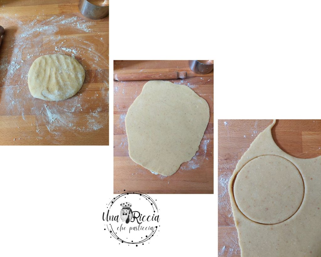 Den erhaltenen Teig auf eine leicht bemehlte Arbeitsfläche geben, schnell mit den Händen bearbeiten und eine Kugel formen. In Frischhaltefolie einwickeln, leicht flachdrücken und mindestens eine halbe Stunde im Kühlschrank ruhen lassen.