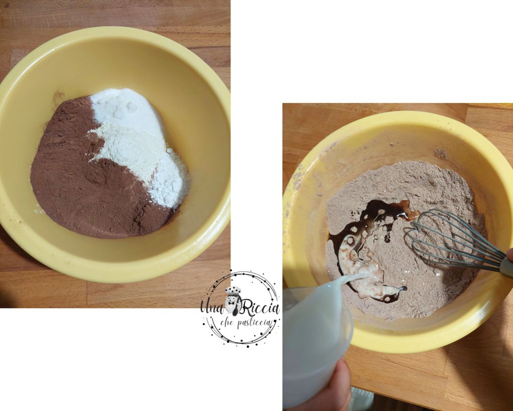 In einer Schüssel geben wir das Mehl, also das Mehl 00, das gesiebte Backpulver, den Nesquik und den Zucker und mischen es mit einem Schneebesen, dann fügen wir das Pflanzenöl und die Milch hinzu und rühren erneut, bis die Mischung glatt und homogen ist.