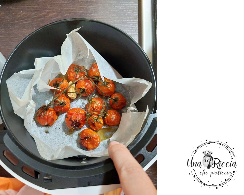 Wir schalten die Heißluftfritteuse ein und heizen sie für 2 Minuten bei 170 Grad vor, währenddessen waschen wir die Tomaten ohne sie vom Zweig zu lösen und schälen zwei Knoblauchzehen. In den Korb der Heißluftfritteuse legen wir eine Silikonform oder Backpapier, um zu verhindern, dass die Soßen herunterfallen. Wir legen die Tomatenzweige hinein und würzen sie mit Olivenöl, einer Prise Salz, einer kleinen Prise Pfeffer und duftendem Oregano.