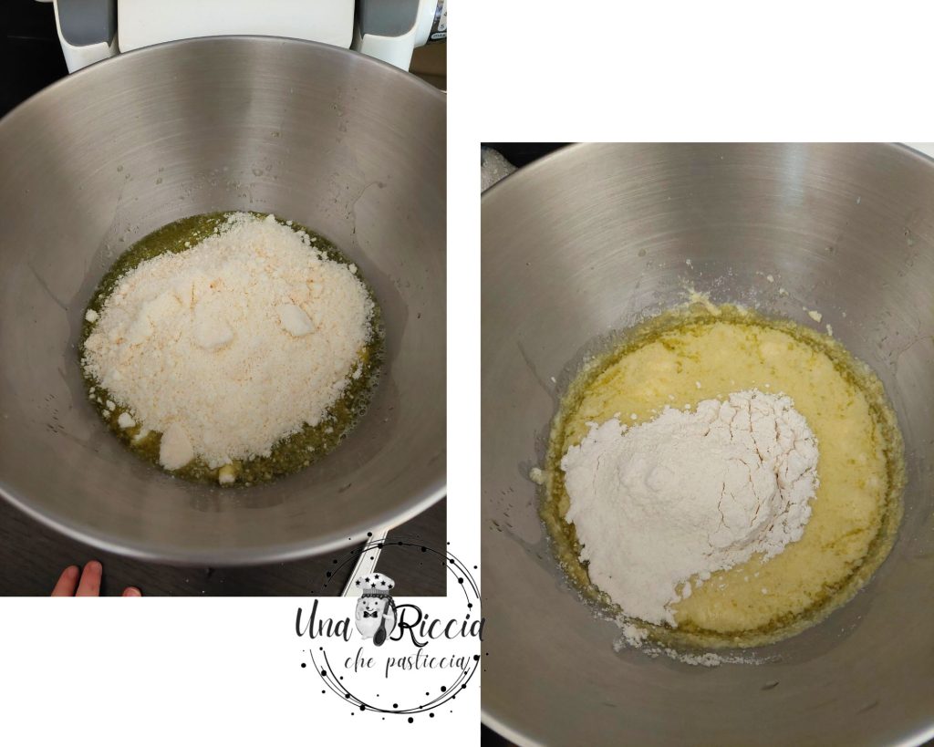Nach dem Schlagen der Eier mit der Milch fügen wir den geriebenen Parmesankäse und den geriebenen Pecorino hinzu und beginnen mit der Küchenmaschine und dem Knethaken zu kneten. Dann geben wir auch das zuvor vorbereitete Mehlgemisch nach und nach hinzu und kneten weiter.