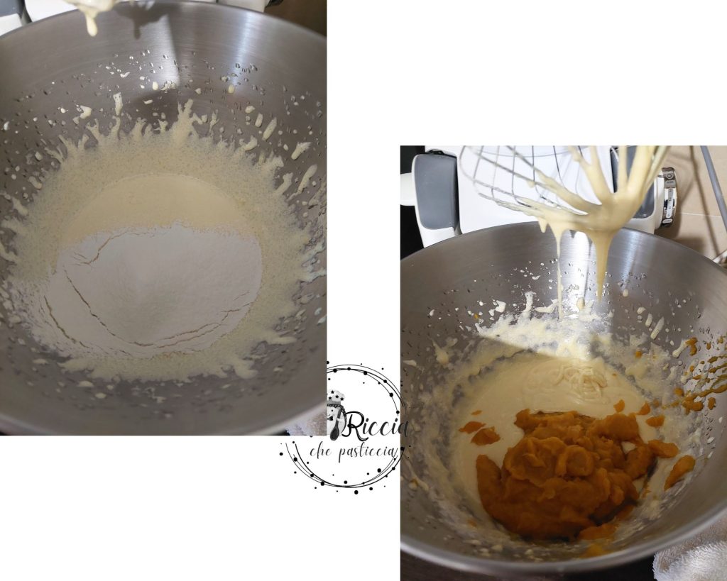 Wenn die Masse schön schaumig ist, fügen wir das gesiebte Mehl hinzu und rühren weiter mit dem Schneebesen. Dann fügen wir das Kürbispüree hinzu und lassen es noch ein wenig kneten.