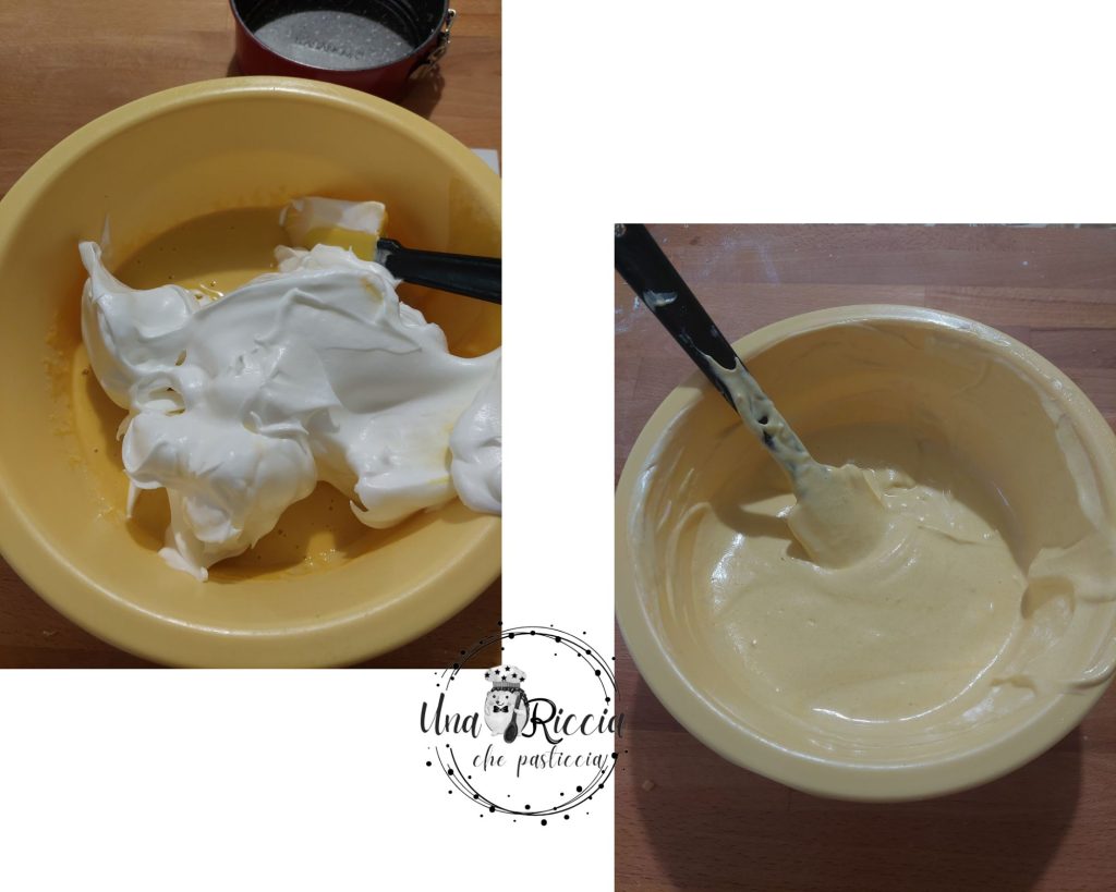Nun können wir die beiden Massen aus Eigelb und Eiweiß zusammenfügen. Wir geben das Eiweiß zur Eigelb-, Mehl- und Kürbismasse und rühren vorsichtig mit einer Spatel mit Bewegungen von unten nach oben.