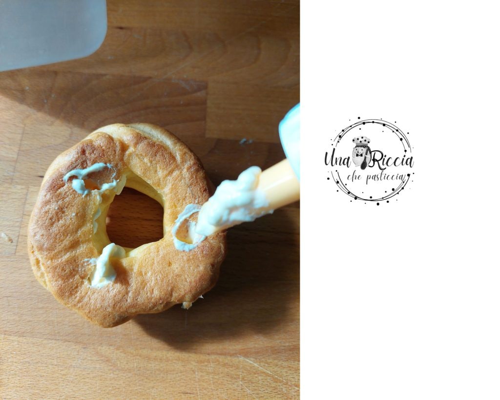 Wir geben den Zeppole-Teig in einen Spritzbeutel mit einer Sterntülle von mindestens 1 cm. Wir formen die Ringe, indem wir der gezeichneten Linie folgen, und drücken den Spritzbeutel stark. Dann machen wir eine zweite Runde, indem wir weniger drücken und die Tülle über der ersten Runde, aber weiter innen platzieren, sodass ein Loch bleibt.