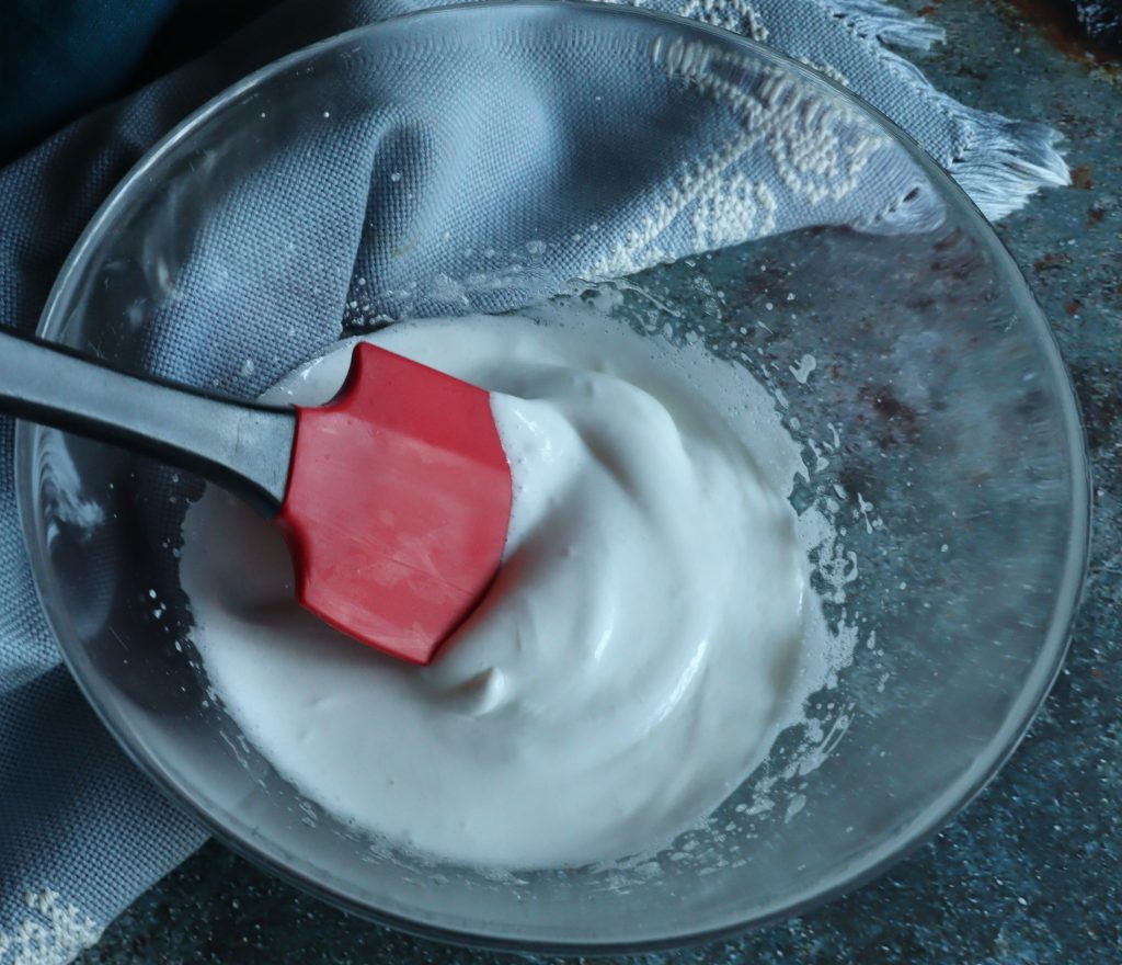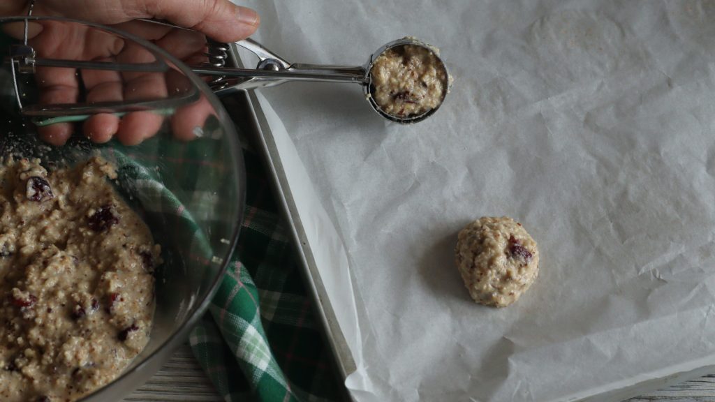 Ich habe einen Eisportionierer benutzt, aber auch 2 Löffel eignen sich gut, um die Kugeln zu formen. Ich habe sie vorbereitet und direkt auf Backpapier auf dem Blech gelegt.