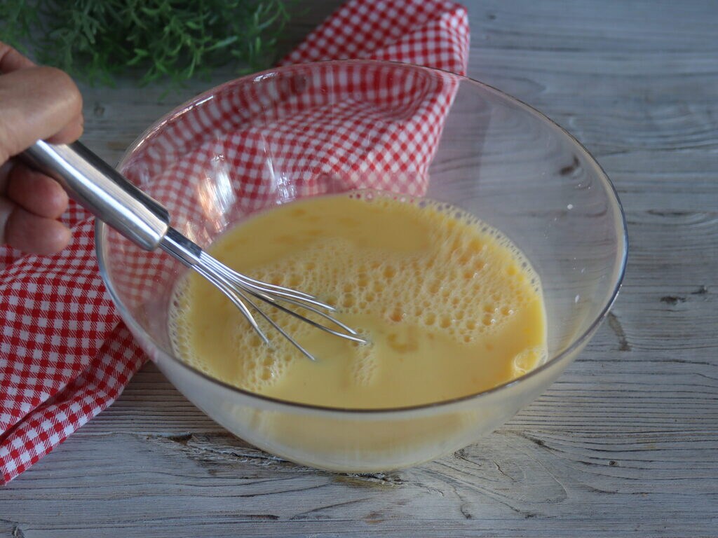In einer kleinen Schüssel schlage ich die Eier leicht und gieße sie in die lauwarme Milch.